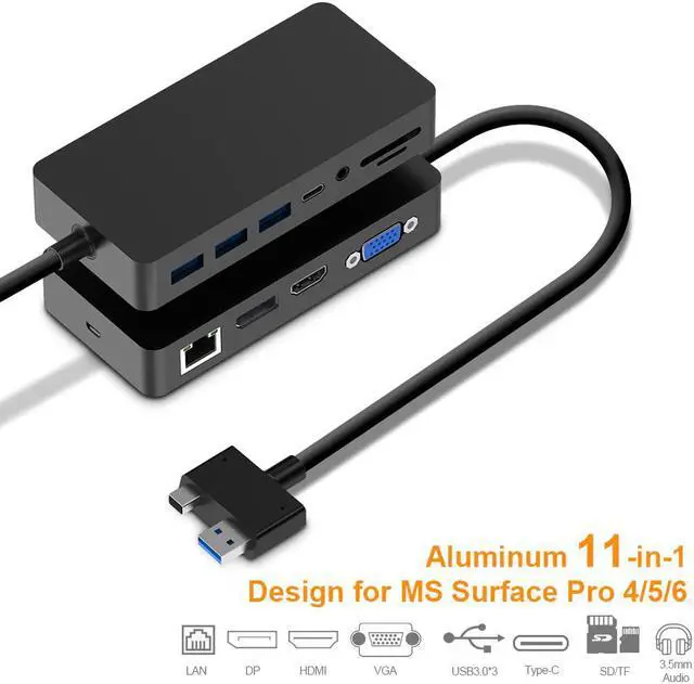 Industry leading technologySpecial design for Microsoft Surface pro 4/pro 5/pro6 including 3xUSB 3.0 port, 1xUSB C port, 1x1000Mb/s RJ45 Ethernet port, 1x port 4K/30Hz , 1xDP 4K/30Hz, 1xVGA 1080P, 1XMicro USB <5V Input Charging Port>, 1x3.5mm audio jack. Compact aluminum shell with solid quality. Easily release heat. Light-weight is convenient for travel or business trip.