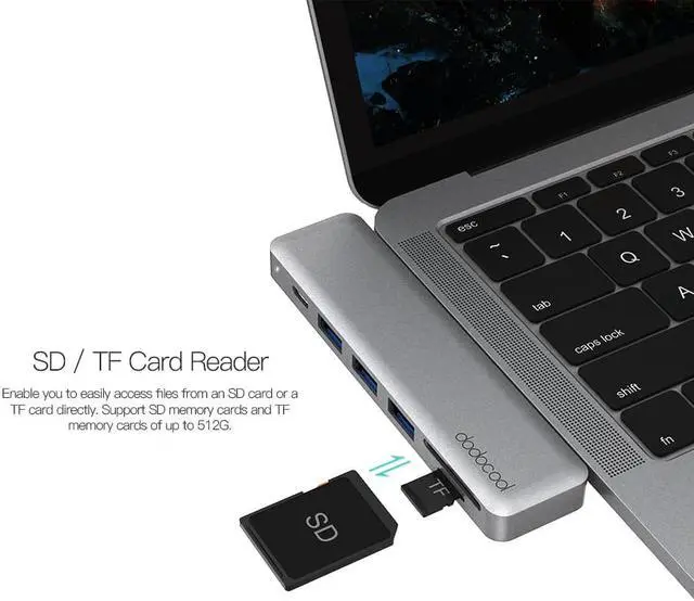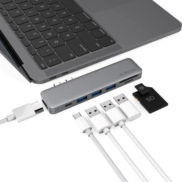 Aluminum Alloy 7-in-1 Multiport Hub with Dual USB-C Connectors easily adds three USB 3.0 Type-A ports, one HD output port, one TF card slot, one SD card slot and one USB 3.1 Type-C port. An ideal solution for your 13.3-inch or 15.4-inch MacBook Pro with two available Thunderbolt 3 (USB-C) ports. This stylish, compact device doesn't require an external power supply, so it fits neatly on an office. You also can slide it easily into your bag on business trips.