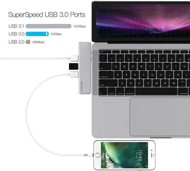 Enable you to connect up to three USB peripherals to your MacBook Pro (2016 / 2017) simultaneously and transfer at up to 5Gbp/s. Backwards compatible with USB 2.0 devices.