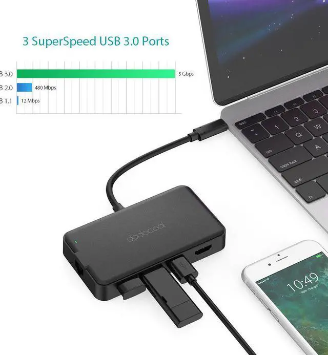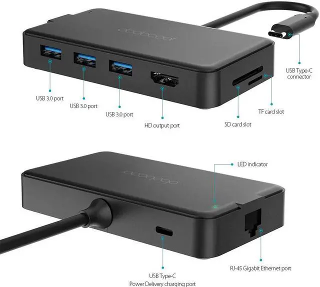 Note: 1. Make sure that the host USB-C port on your device complies with the USB 3.0 / USB 3.1 specification. Compatible with USB 2.0 Type-C device. 2. To use the HD output port, the host USB-C port from your device must support DisplayPort Alt Mode. 3. To use the Power Delivery function to power and charge a connected USB-C laptop, the host USB-C port from your device must support USB Power Delivery. The USB-C input charging port cannot be used for transmission. 4. Please do not rely on the USB-A ports for charging your phones, tablets or other devices. The three USB 3.0 ports on the hub support a total output of up to 5V 900mA. 5. For a stable connection, do not use this hub with high-power devices. It supports one hard drive max. 6. Not support charging for laptops and tablets via the PD USB-C charging port. 7. Not compatible with tablets and Zenbook UX330UA. 8. Charging Power Delivery enabled Dell USB-C laptops via the PD USB-C charging port requires using your 55W or above original power adapter. 9. The SD card slot and the TF card slot can be used at the same time.