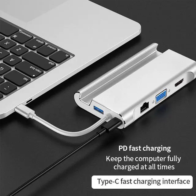 7-in-1 Multi-Function Docking Station : 3*USB3.0+Type-c++VGA+RJ45USB3.1 5GBPS high-speed transmission rate, can be extended to connect U disk, mole phone, solid state hard disk, etc., to improve work efficiency;