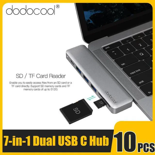 Aluminum Alloy 7-in-1 Multiport Hub with Dual USB-C Connectors easily adds three USB 3.0 Type-A ports, one HD output port, one TF card slot, one SD card slot and one USB 3.1 Type-C port. An ideal solution for your MacBook Pro with two available Thunderbolt 3 (USB-C) ports. This stylish, compact device doesn't require an external power supply, so it fits neatly on an office. You also can slide it easily into your bag on business trips.