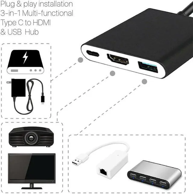 3-in-1 Multi-functional Type C to Hub; USB Type-C port + HD port + Charging Port