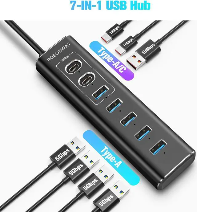 - 1x 7 Ports Powered USB Hub(5.7x1.8x0.9inch) with 2-in-1 USB-A/USB-C data cable(3.3ft)