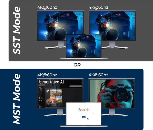 Important Note: Requires a graphics card that supports DP 1.2 or above, and the use of DP 1.4 (or higher) certified DisplayPort cables no longer than 1.8m. macOS does not support MST (only mirror mode is available, not dual extended displays). Not compatible with HDMI-to-DP docking stations or adapter cables on the DP input port.