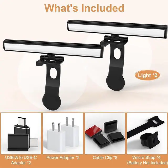 All-Inclusive Kit with Seamless ConnectivityIncludes 2 light bars with detachable magnetic mounts, 2x USB-C power cables, 2x adapters, 4 cable organizers, and 2 Velcro straps. Plug-and-play design works with laptops, monitors (17"-35"), and USB-C/USB-A portsno batteries required. Backed by a 12-month warranty and lifetime color consistency guarantee.