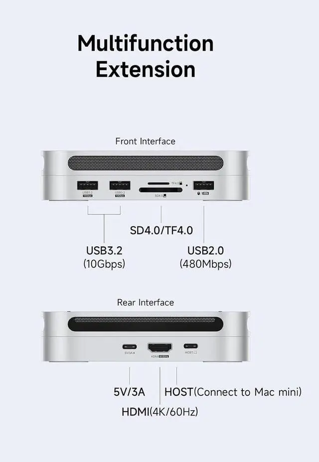 Multiple interfaces: Hagibis Mac Mini M4 Dock with M.2 NVMe SSD enclosure, 4K@60Hz HDMI, 10Gbps USB3.2 Gen2 *2, 480Mbps USB2.0 *1, SD4.0/Micro SD4.0 card slot and 5V/3A power supply ports. Various interfaces meet all your needs