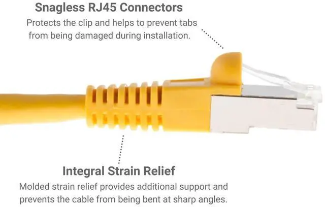 Snagless Half-Moon Boot for Easy Installation -Featuring a molded snagless boot design, this yellow Ethernet cable 100 ft slides smoothly through tight conduits and behind desks without catching or tearing. The durable CM jacket meets UL-1865 flame rating standards, making it ideal for both home offices and server rooms.
