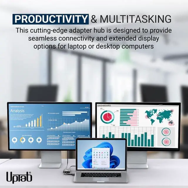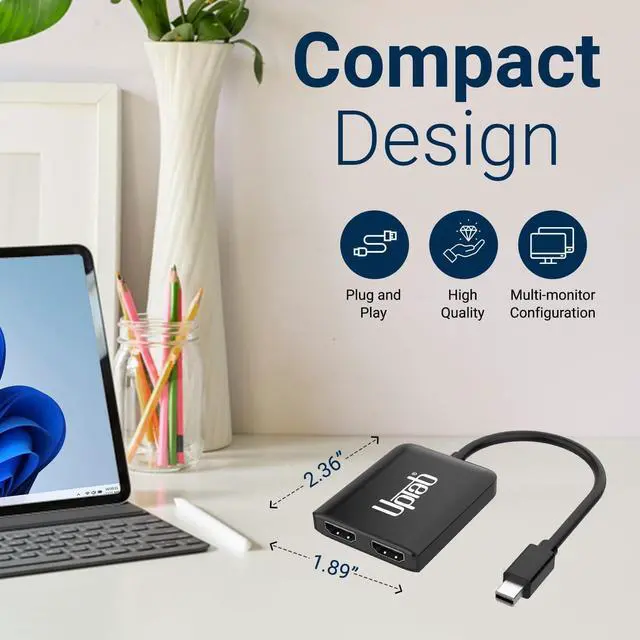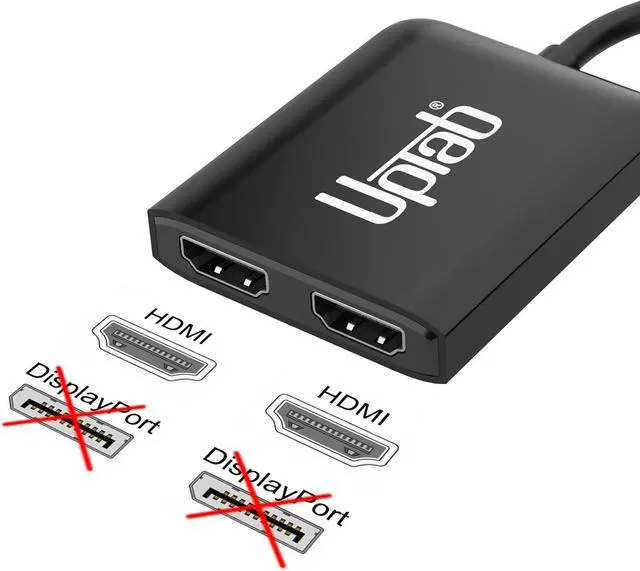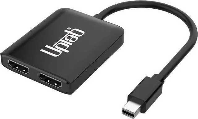 This UPTab Mini DisplayPort to Dual HDMI Adapter 4K 60Hz MST allows a Mini DisplayPort enabled device to connect to two HDMI enabled TVs, Projectors, or displays for video mirroring, video extension, or viewing a single video image across two displays. The hub is perfect for graphic design, spreadsheet analysis, digital signage applications, and gaming. Improve multitasking and increase productivity by configuring the hub to work as a splitter with the same video image on each display, extending a video image to multiple displays, or expanding a video image by joining multiple monitors together as one display. The hub is ideal for a multiple display desk setup and the lightweight, small form factor, also makes it easy to carry while traveling or just on the go. The hub supports resolutions up to 4K at 60Hz or 1080p at 120Hz when connected to dual displays. The adapter will enable true RGB color without the visual color degradation that occurs in other color formats that use sub-sampling. When audio is desired, the Mini DisplayPort adapter will also transmit up to 2-channel audio for an immersive audio and video experience. Transmits video over dual HDMI single or simultaneously. Extended display mode is supported only for Windows 11, 10, 8, and 7. Currently, Apple macOS does not support (EST) Extended mode.