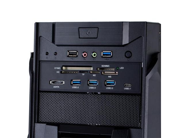 1. Multifunctional front panel device with USB 3.0 hub, card reader, USB 3.1 port and eSATA port. It supports super-speed USB 3.0 with a bandwidth of up to 5 Gbps through three front USB Type-A ports, one front USB 3.1 Type-C port, one front eSATA port, and an all-in-one high-speed card reader.