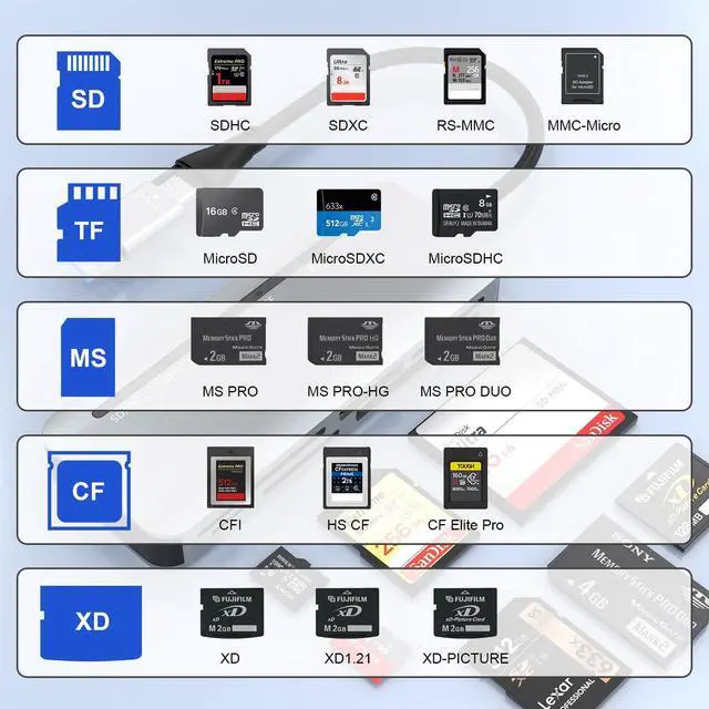 3. Supports most standard memory cards, including TF/SD/XD/MS/CF