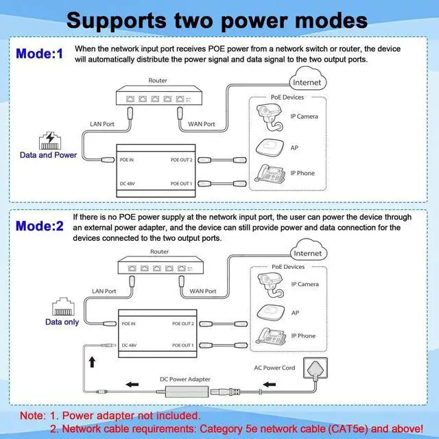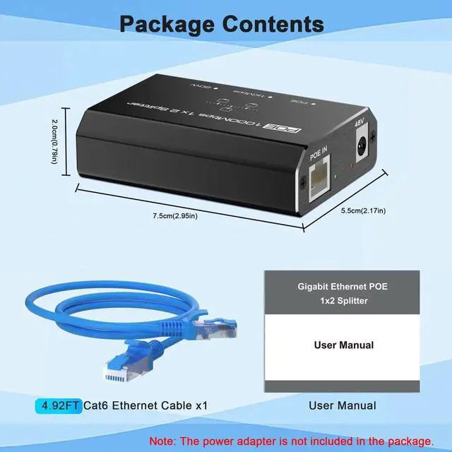 - [Note on Power Adapter]Please note that this product does not come with a power adapter. It relies on the POE input to power itself and its connected devices, allowing for greater flexibility in power supply arrangements. Please make sure you have a compatible POE switch in your network or connect a power adapter to power the splitter.