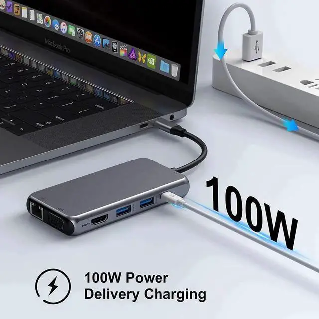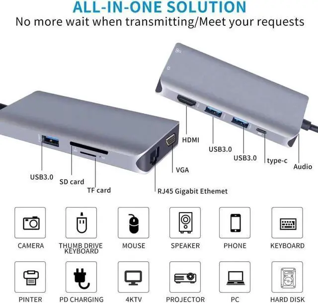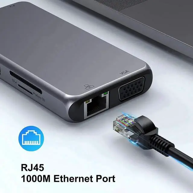 USB-C Hub: USB-C devices with the multiport USB-C hub featuring, 4K@30Hz HDMI port, VGA port, 2 USB 3.0, 1 USB 2.0, RJ 45 Gigabit Ethernet, 87W PD charging port, SD/TF card reader and a 3.5 mm Audio jack.