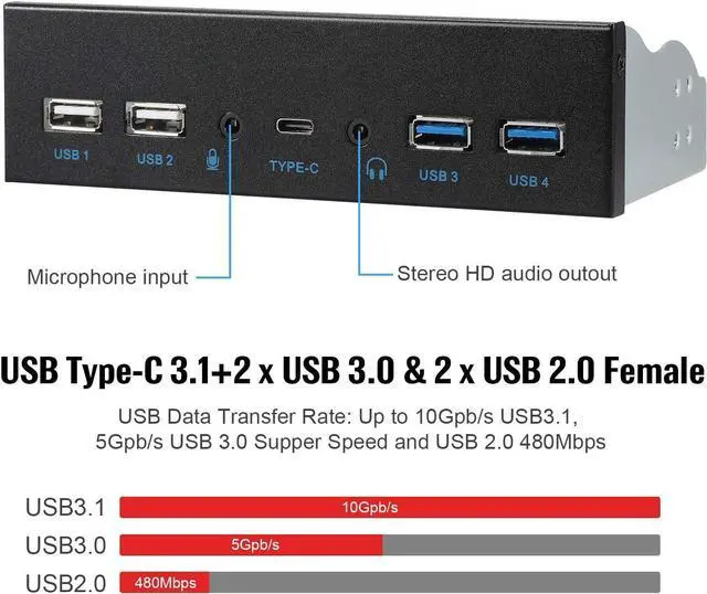 Turns any available 5.25 -inch computer case front bay into a 5 Port USB hub, USB 3.1 Gen 2 Type-C, 2 ports USB 3.0 and 2 ports USB 2.0