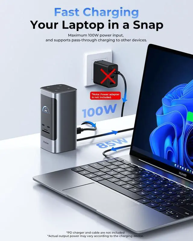 [PD 100W Fast Charging & Power Your Laptop Non-Stop] : Maximum 100W power input with the USB-C PD port, supporting pass-through charging to your laptop with output up to 85W. Laptop docking station 3 monitor allows you to enjoy full power every day. It is recommended to connect an adapter of 65w or above, please use a 100w adapter when the device is fully loaded. (!Note: Power adapter and input cable are not included.)