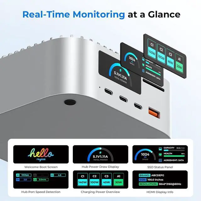 Built-In Smart Display & Real-Time MonitoringStay informed with the integrated 1.65-inch smart screen. It shows real-time data, including a welcome boot screen, hub power draw, port speeds, charging power overview, SSD status, and HDMI display info for complete system control.