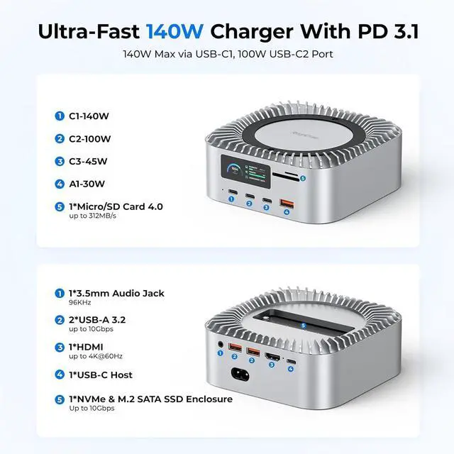 165W GAN Power DeliveryPower all your devices at once. With a 140W USB-C (PD 3.1) port, a 100W USB-C, a 45W USB-C, and a 30W USB-A port, this docking station delivers up to 165W total outputperfect for laptops, tablets, cameras, and more.