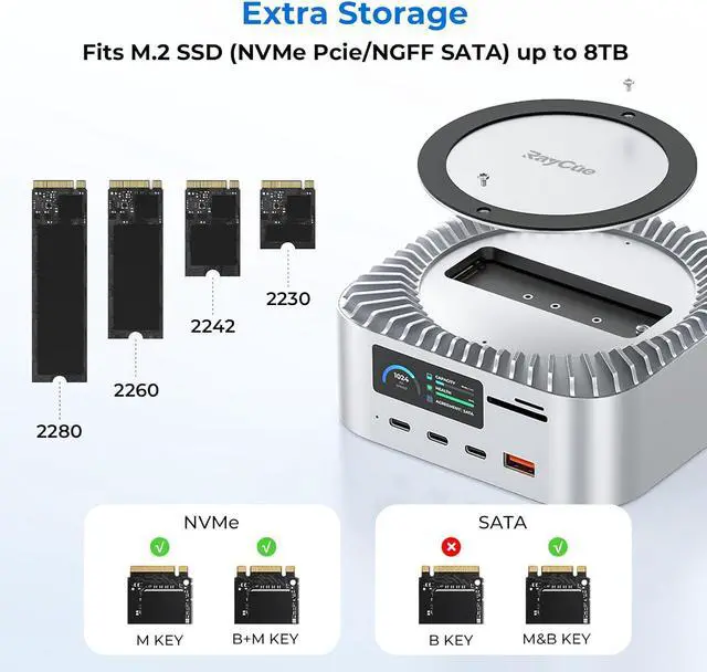 Support 8TB M.2 NVME/SATA EnclosureThis Mac Mini docking station is equipped with a built-in Hard Drive enclosure, capable of running M.2 NVME/SATA, supports up to 8TB, and most SSD sizes (M.2 2230/2242/2260/2280).