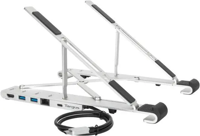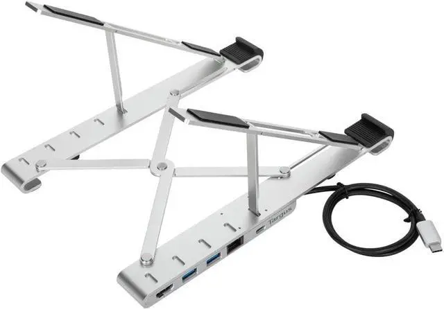 Robust laptop stand with integrated dock, foldable to compact size (25.3 x 6 x 1.83 cm), ideal for modern hybrid workers travelling between work locations