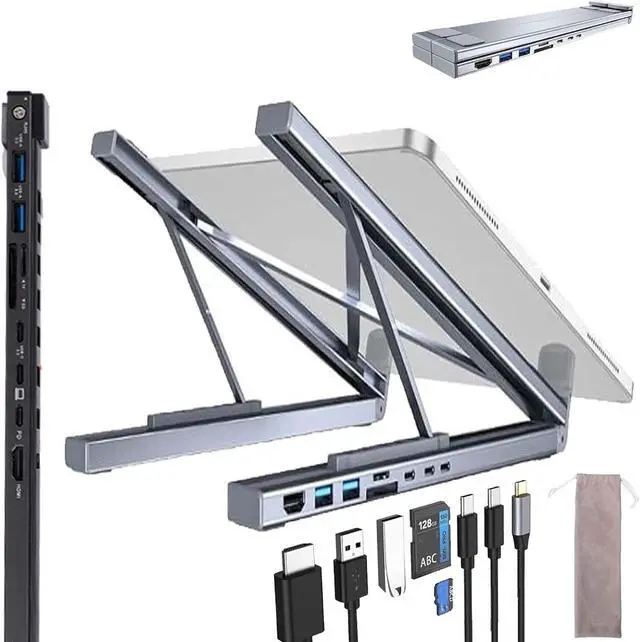 • 8-in-1 Multifunctional USB-C Laptop StandCombining a USB-C docking station with a laptop stand, this all-in-one device meets your connectivity and ergonomic needs. Designed for professionals, students, and digital creatives alike.