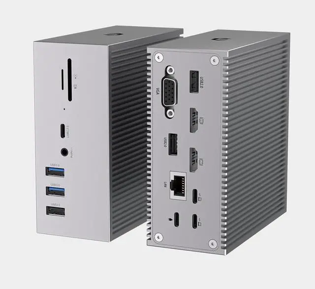 16 in 2 Docking Station: Connect multiple devices for display expansion, data transfer, and charging. It features dual 4K HDMI, one VGA, 55W PD, USB C 3.0, two USB 3.0, three USB 2.0, Gigabit Ethernet, two USB C hosts, SD/TF card reader, and a 3.5mm audio/mic combo.