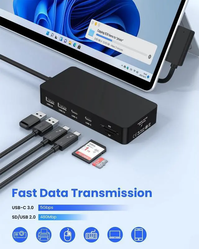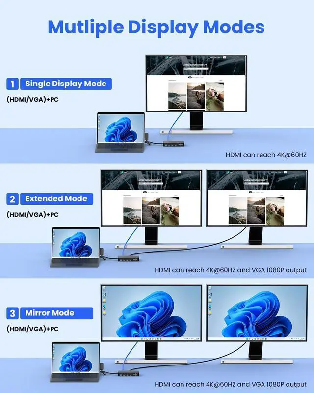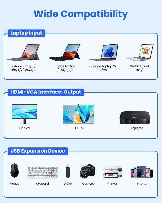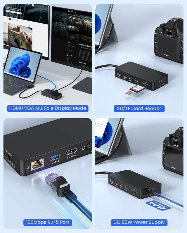 Docking Station 11-in-1, Dual Monitor for 4K HDMI + 1080p VGA, 5Gbps USB 3.0 (Type-A/2x Type-C), 2 xUSB A 2.0, SD/TF, DC in, RJ45, Laptop Docking Station Adapter for Microsoft Surface