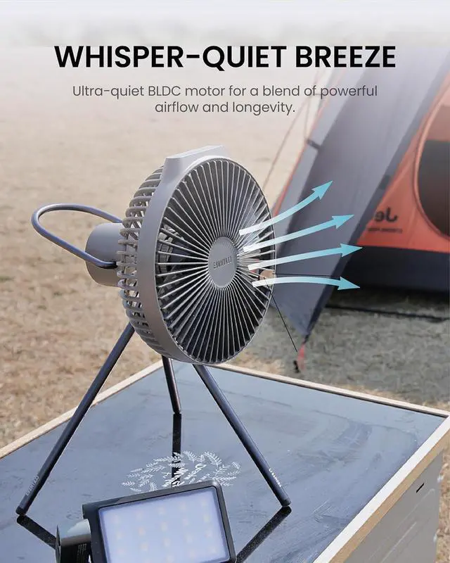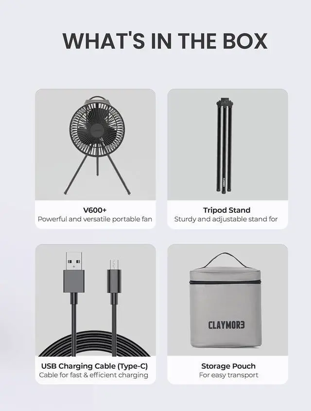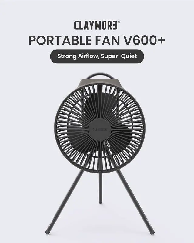 Claymore Portable Fan V600+ (Warm Gray) - Portable Fan with Airflow for Outdoors Use & Indoor Living Room, Desk, Table Fan. Super Quiet, USB-C Charging, Long-Lasting Battery, Includes Storage Case. CLAYMORE Tripod Stand (Light Khaki) - Lightweight Aluminum Outdoor Action Camera, Fan & Lighting Stand, 1/4" Mount, 19-75in, 360° Ball Head, Wind-Resistant. Carrying Case and Dual-Sided Hook.