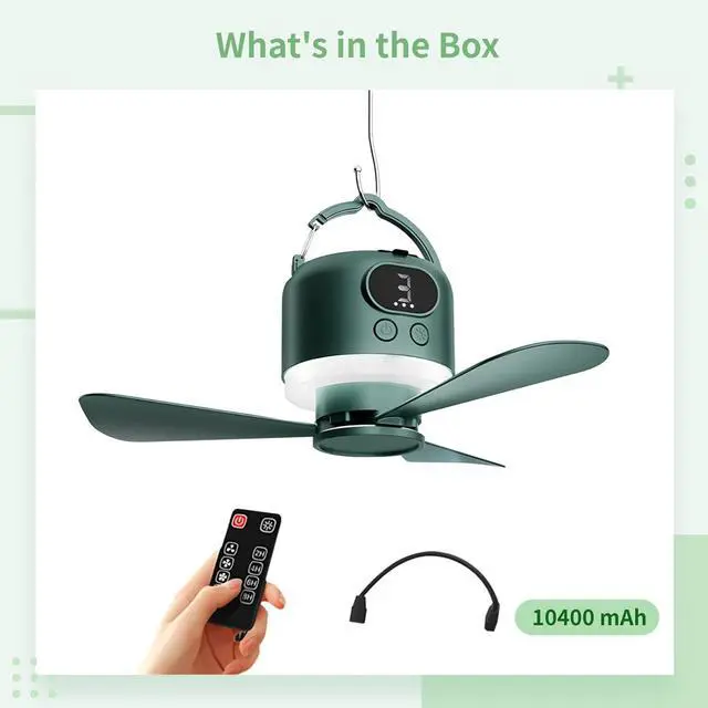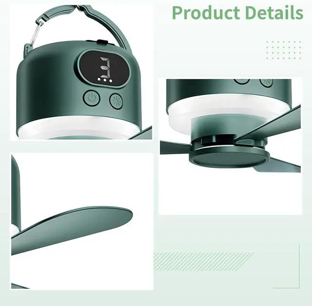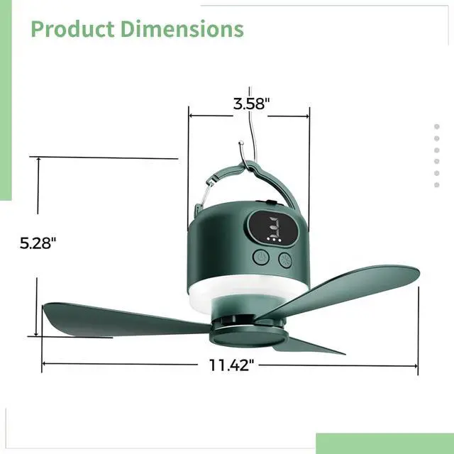 Color:green Material:ABS Product Size: 12.6 in x 5.91 in x 3.94 in Package Includes:portable ceiling fan x 1 Note: - Please refer to the measurement. Tiny measuring error is allowable in normal range. - There might be a little color difference due to the monitor, camera or other factors, please refer to the physical item.