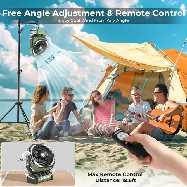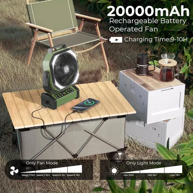20000mAh Rechargeable Battery: Powered by 20000mAh high-capacity battery, the camping fan only requires 9-10 hours of charging and can work max 112 hours on the lowest speed. Equipped with a type-C output and a USB output ports for easily powering two devices simultaneously. A summer camping essential for emergency power outages