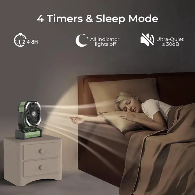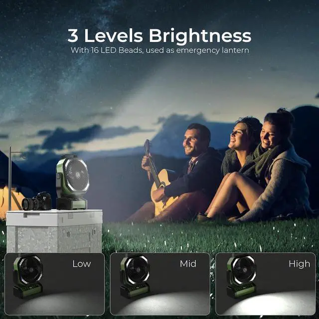Adjustable LED Light & Timer: With 16 LED beads offering 3 adjustable brightness levels up to 150LM, this portable fan is suitable for various occasions such as bedrooms, offices, camping, RVs, and power outages. It also features 4 timer settings (1/2/4/8H) for energy-saving use