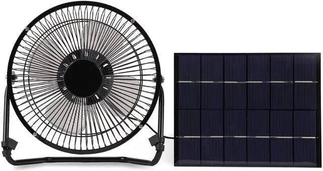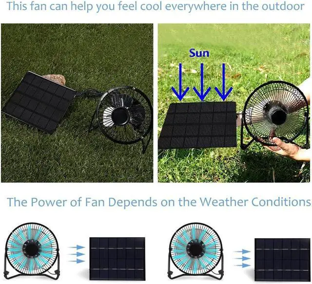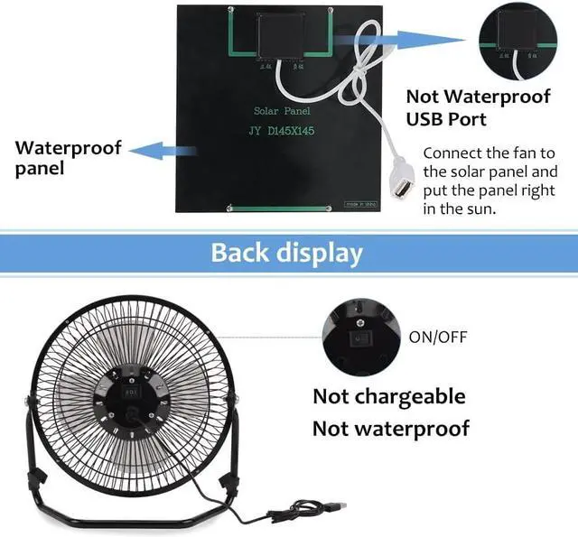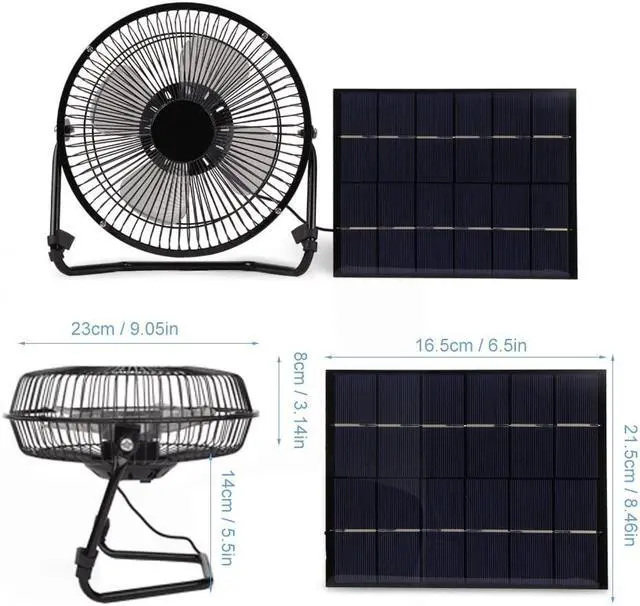 Solar Panel Powered Fan Green power free energy and good quality workmanship, new tech power design. Support USB Charge In the sunless weather, you can also use the mobile power supply to power our small fan, such as laptop, USB outlet, PC, power bank and so on. Never idle. Great for Outdoor Activity Our solar fan is the best choice for outdoor places without power. Small in size, portable and practical. for home office in the summerfor pet house aeration, chicken house, tree house, dog house, greenhouse, RV, touring car, campingfor outdoor travelling, fishing, hiking, picnicThe operating efficiency of fan will depend on the sunlight intensity while it plugged to the solar panel. The solar panel runs the fan fast under direct sunshine. The solar fan will working more slow or stops working when the sunshine is weak. Color: BlackMaterial: Monocrystalline SiliconPower: 5.2W/6VOperating Current: 0865MAFeature: WaterproofSize: 210×165MM/8.27×6.5 inchMaterial: MetalSize: 9.05* 5.5* 3.14 inchUSB Cable Length: Approx 90 cm/35.4 inchWeight: Approx 920gThe surface of the waterproof solar panel makes you feel more at ease when you use it outdoors. Please note that although the surface of our solar panels is waterproof, the USB port and small fan are not waterproof, so please do not let our product soak in water. Please also put the product away as soon as possible when it rains to extend the service life. USB SOLAR FAN Widely Application Specification Waterproof Panel NOTICE