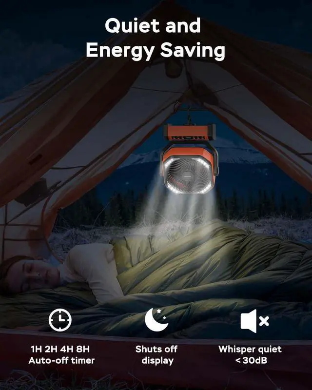 Long-Lasting Battery: Built in large 20000mAh rechargable battery, this camping fan offers up to 112 hours of cool breeze on soft wind; It take only 10 hours to get full charged, USB C cable also come with the fan for convenient charge. Cordless fan have one USB-A output port and Type C output port to charge your device in any emergency