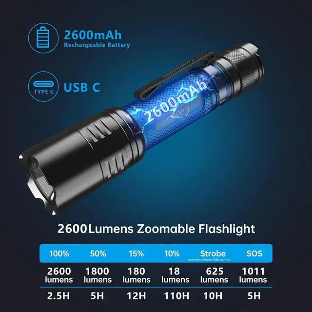FAST CHARGING AND HIGH CAPACITY - Our LED flashlight is equipped with a high-capacity 2600mAh rechargeable battery, providing up to 110 hours of continuous runtime in low mode. The duty light features a USB-C smart charging interface, fully charging in just 4.5 hours.