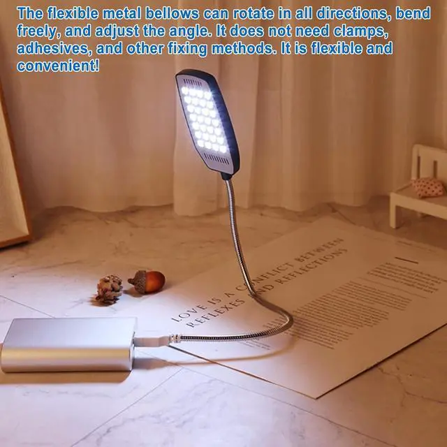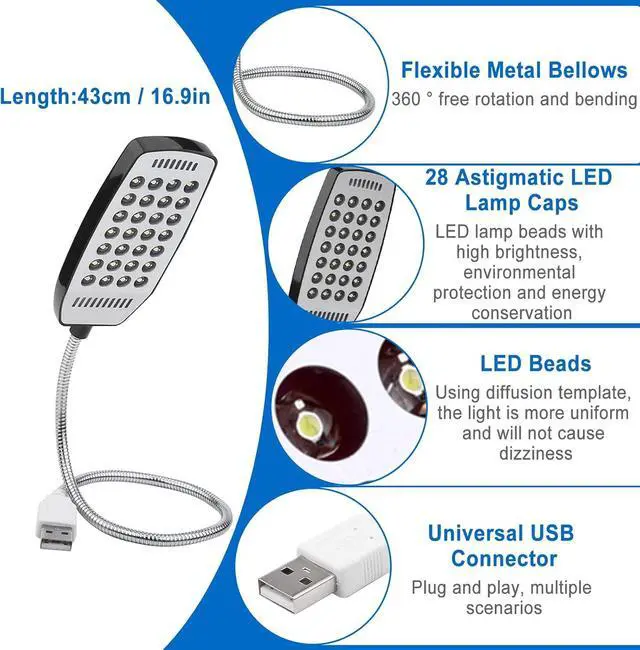 Adopts 28 LED as light source , for long-lasting , eco friendly , low power consumption and energy saving . Flexible gooseneck design , you can arbitrarily adjust the lighting angle according to your need . Powered by a PC USB port , no batteries and other external power are needed . Plug into your PC USB port , it starts to bring you brightness right now , easy to use . Ideal for lighting your laptop in the darkness . An ideal companion for students , travelers , office workers .