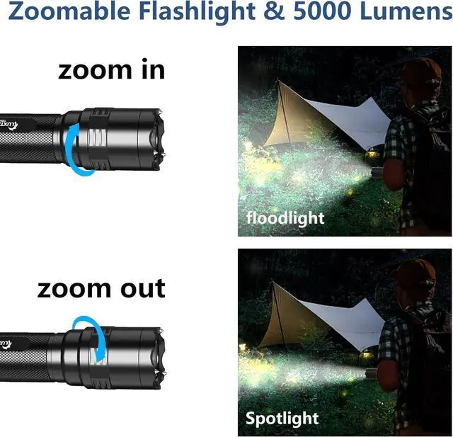 6 LIGHTING MODES & VARIABLE ZOOMING- This high lumen rechargeable flashlight has 6 lighting modes at the click of a button:High-Medium-Low-Moon-Strobe-SOS.Zoomable flashlightIn any mode, we can turn off the LED flashlight by pressing and holding the button for 2 seconds. Depending on our needs, we can extend the head of the handheld flashlight to adjust the focus and freely choose between long-distance observation and wide-area illumination.