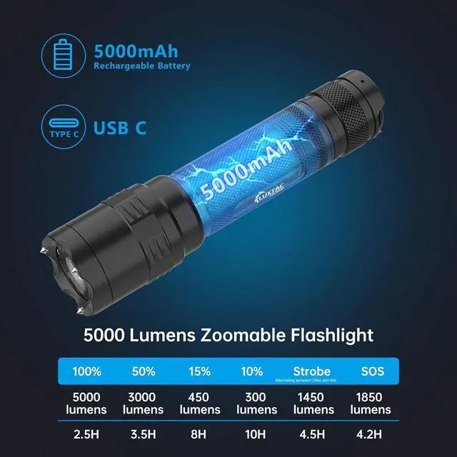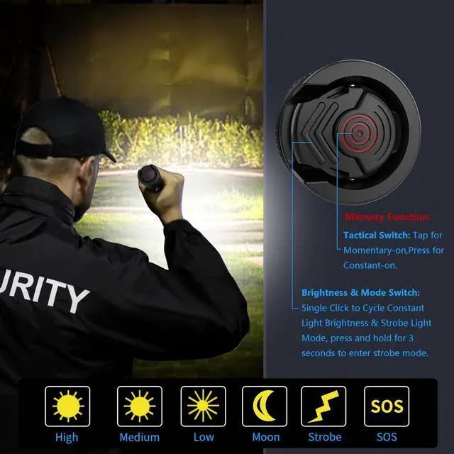 SUPER BRIGHT HIGH LUMENS FLASHLIGHT - The new rechargeable flashlight comes with an upgraded chip that improves performance by 30%. Equipped with a high output of up to 5000 lumens, this duty belt flashlight has an extended beam length of nearly 358 feet, making it highly effective for a variety of professional law enforcement/camping and recreational purposes. The tactical flashlight is comparable in brightness to a car headlight, so avoid direct exposure to your eyes.