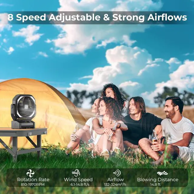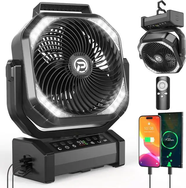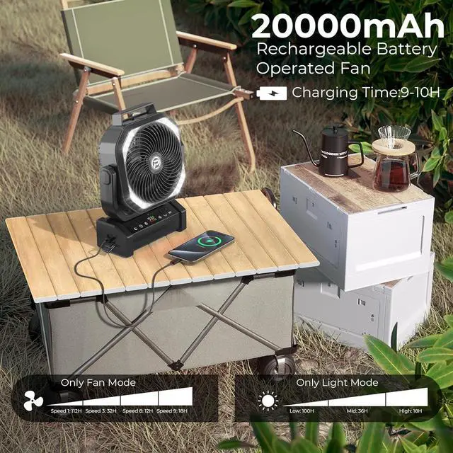 20000mAh Rechargeable Battery: Powered by 20000mAh high-capacity battery, the camping fan only requires 9-10 hours of charging and can work max 112 hours on the lowest speed. Equipped with a type-C output and a USB output ports for easily powering two devices simultaneously. A summer camping essential for emergency power outages