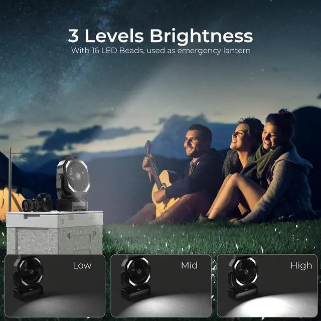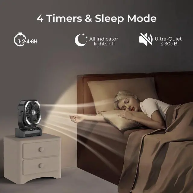 Adjustable LED Light & Timer: With 16 LED beads offering 3 adjustable brightness levels up to 150LM, this portable fan is suitable for various occasions such as bedrooms, offices, camping, RVs, and power outages. It also features 4 timer settings (1/2/4/8H) for energy-saving use