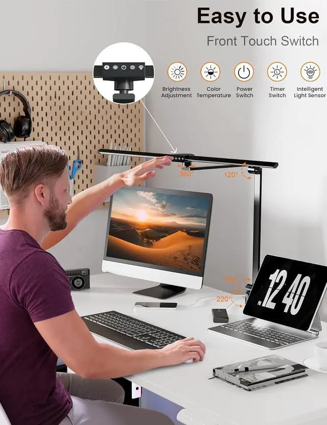 [Double Headed Swing Arm Desk Lamp]: Desk lamp features dual lamp heads that are detachable and rotate 360 degrees to provide a larger lighting range. Can also be folded and adjusted via dual swing arms with a height range of 1.87-2.82 ft, allowing you to use it comfortably while working or studying.