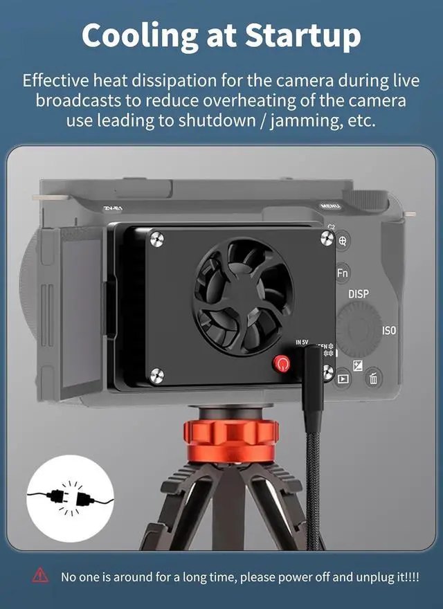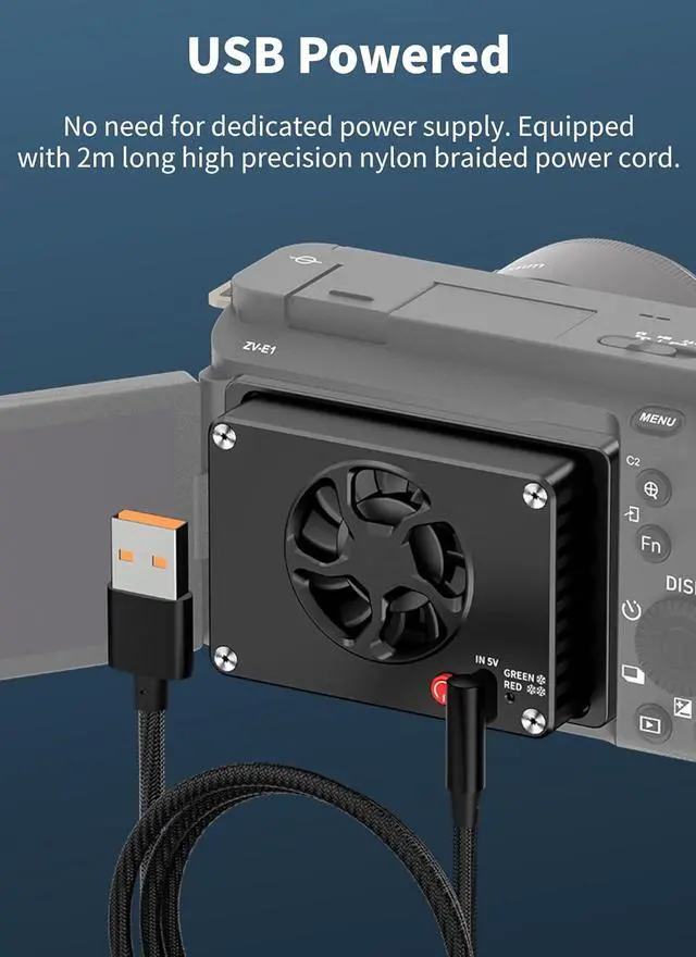 Type C 5V Input: Considering the efficiency of cooling, cooling fan is powered by Type C 5V input, and after connecting the fan to the camera, power bank or other suitable power input, it can deliver high efficiency of heat dissipation during long time .