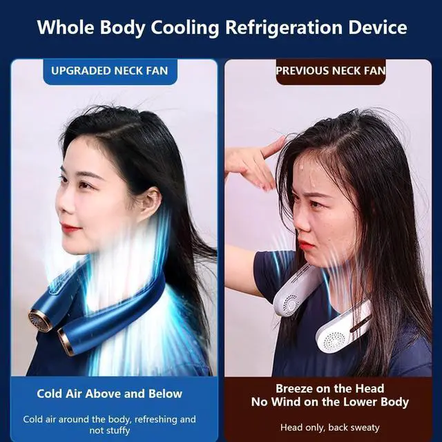 360° Surrounding Up and Down Airflow Cooling: Unlike traditional neck fans, which blow only on the head and no wind on the lower body; this upgraded fan adopts the upper and lower dual-drive 8-air ducts, with cool and refreshing breeze covering the whole body, truly achieving full body cooling.