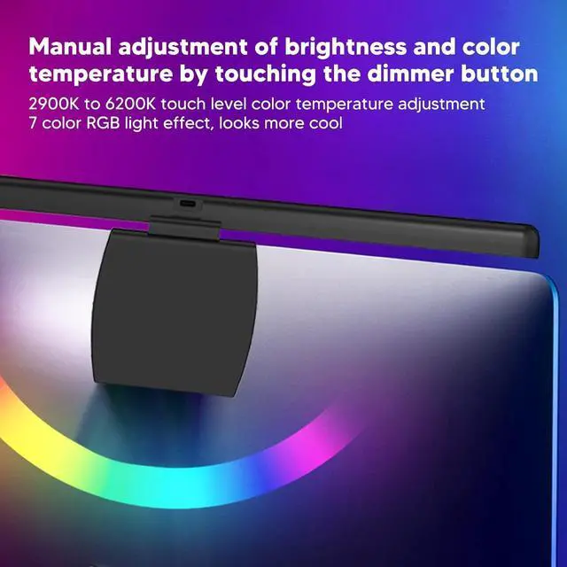 TOUCH DIMMINGThe office screen light allows you to manually adjust the brightness and color temperature by touching the dimming button. 2900K to 6200K touch triple color temperature adjustment, cool and warm light switch at will, with 7-color RGB light.