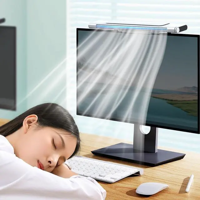 2-in-1 Space Saving DesignThe breakthrough design mounts on top of the monitor, saving valuable space on your desk. Also, this personal desk Fan can stand on the table by using the base. * It works on flat monitors, curved monitors, laptops with a thickness of less than 1.18 inches/ 3 cm.