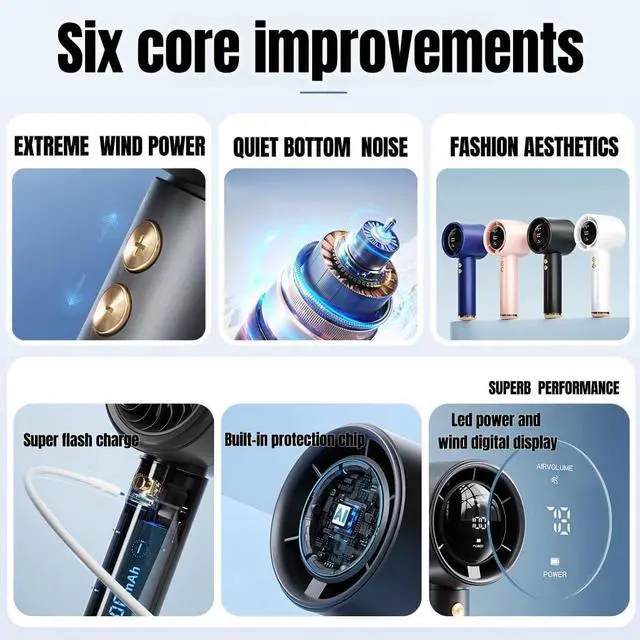 Brushless Motor - Super Power: The combination of a three-phase brushless motor and a 3000mAh battery significantly improves the wind speed, power, and endurance. The maximum wind speed can reach 9m/s. The highest rotation speed of the handheld fan is three times that of a regular personal fan, reaching up to 13000 RPM. It can cool for 3.5-15 hours on a single charge Scroll switch - customizable wind speed: The wind speed of this small fan is adjustable. Portable fans can be customized from 1 to 100 speeds to meet your various wind power generation needs in any scenario Technical Design - Cold Air Delivery: Personal fans utilize a turbine structure and powerful motors to quickly compress and cool the intrapped hot air, converting it into cold air blown out. On a hot day, this can quickly calm you down. The body of this turbofan is made of ABS material and uses precise plastic spraying technology. Its sleek cylindrical design provides an excellent tactile feel Digital Display - Power Reminder: This portable fan for travel is equipped with a high-definition digital display screen, which can show the current wind speed and remaining battery power, so you no longer need to worry about the remaining power of the fan. When the battery of this mini fan is low, you can arrange for charging in advance, ensuring a cool companion on every trip Small size-portable and anti-loss: The size of this portable mini fan is only 6.14*2.38*2.28 inches 0.47lb, you can put it in your pocket or bag, so no matter where you go, this handheld fan can keep you cool, it is a cool companion for your travel and outdoor sports, and it is also a thoughtful gift for women/men Multiple Charging Ways - More Convenience: This USB rechargeable fan can be fully charged in just 2-3 h
