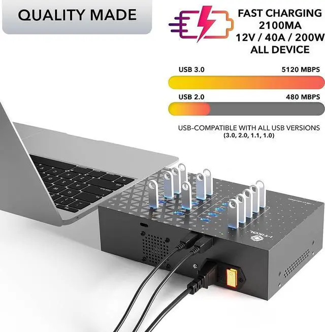 FAST USB 3.0 HUB - Box Shaped 20 Port USB 3 Hub Charger and Data Transfer has a Speed of Up to 5 Gbps. The Power above and all 20 Ports give 2100mA at the same Time, allowing this Hub to charge a large Number of Devices simultaneously, without the loss of Speed and Power. IMPORTANT: USB 3.0 Ports are compatible with any USB 2.0 Device, just keep in mind that it will run with USB 2.0 Speed and at not more than 480 Mbps.