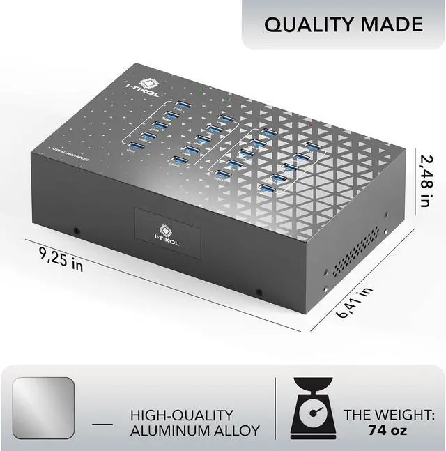 QUALITY MADE - Dimensions of the USB Charging Station are 9,25x6,41x2,48 Inches. The black Metal Housing of the Desktop Charging Station is made of High-Quality Aluminum Alloy. This Power Splitter has a built-in 5V 40A High Power Adapter & a Cooling Fan, triggered by a built-in Temperature Sensor for over 122-131°F. Multi USB Port has an on/off Switch on its Housing. When the Plug Splitter is on, the blue Light Indicator illuminates & each of the Multiple USB Ports of the USB Multiport Charger also lights up blue.