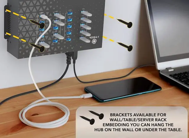 20 PORTS FOR HOME & OFFICE this Charging Station for Multiple Devices allows you to charge up to 20 Devices simultaneously, with a Speed of up to 5120 Mbps / 5.12GB. Industrial Grade Powered USB Hub is equipped with a Power Switch, an internal blue Light, and LED Indicators. Mounting Brackets supplied with the USB Port Hub provides an opportunity to mount the USB Dock on any Wall, Table, or Server Rack.
