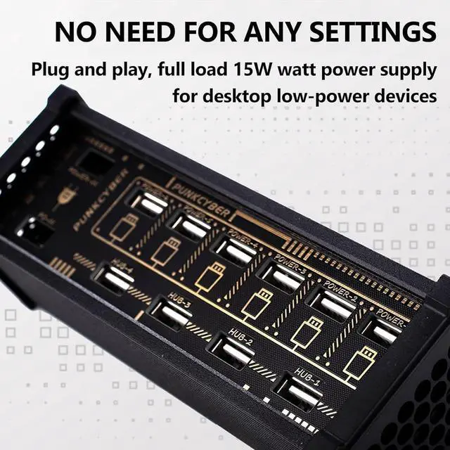 Low PowerAdaptable output provides up to 15W of total power to desktop devices. Supports 5V input via the Type-C port, making it a versatile power distributor for multiple low-power devices.
