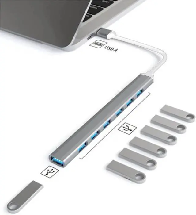 7 in 1 Multi-functional Hub USB C hub with 1 x USB 3.0 port and 4 x USB 2.0 ports, 2 x USB C 2.0 port . USB 3.0, 5Gb/s transfer speed , USB 2.0: 480bps transfer speed, quickly transfer and download videos, music, photos and other files.