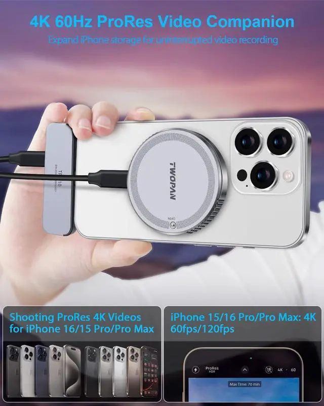 4K ProRes Video Shooting: Easily shoot breathtaking 4K ProRes footage on your iPhone 16/15 using external SSDs or hard drives via the USB-C 3.2 port. Ensure your storage device offers sufficient read/write speeds for smooth filming